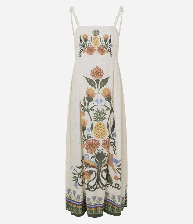 Vestido Midi em Viscose com Estampa e Decote Quadrado Off White