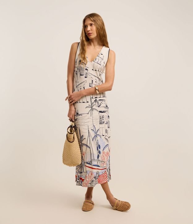 Vestido Midi em Viscose Gola V e Estampa de Coqueiros Branco