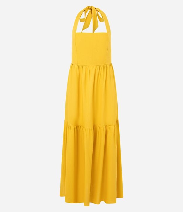 Vestido Midi Frente Único em Viscolinho com Recortes Mostarda