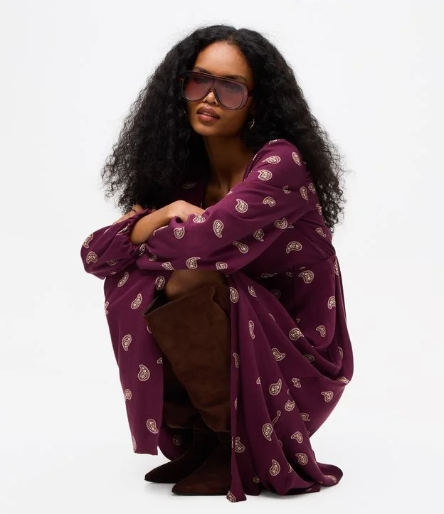 Vestido feminino confeccionado em twill de viscose mais sustentável, com caimento fluido e toque leve, apresentando estampa paisley distribuída por toda a peça. A modelagem evasê alongada valoriza a silhueta com movimento, enquanto o decote em V e as mangas longas com punhos ajustados trazem equilíbrio entre elegância e conforto. O comprimento midi longo torna o vestido versátil para composições que transitam do casual ao elegante com facilidade no dia a dia.