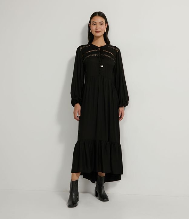 Vestido Midi Manga Longa Bufante e Babados na Saia