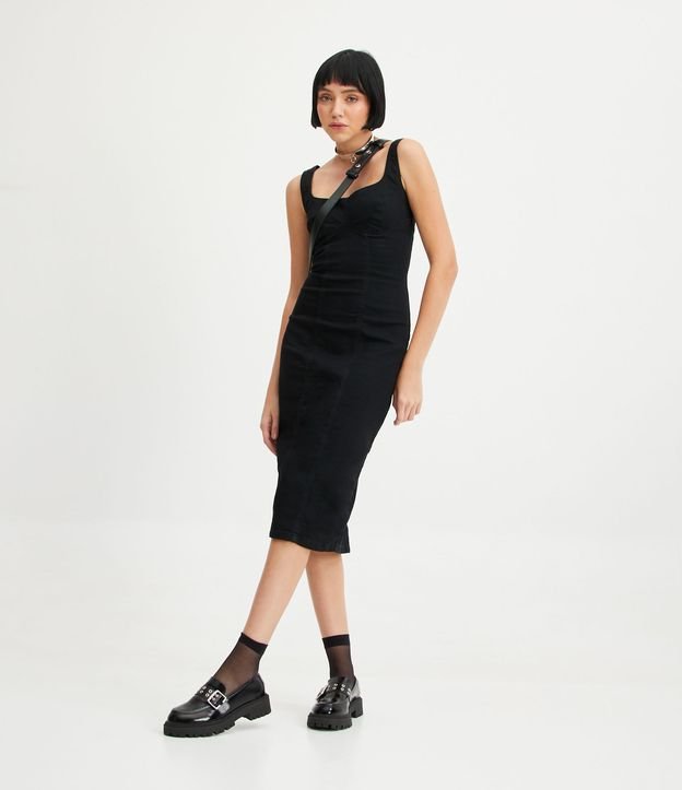 Vestido Midi Sem Manga em Jeans com Fenda Traseira