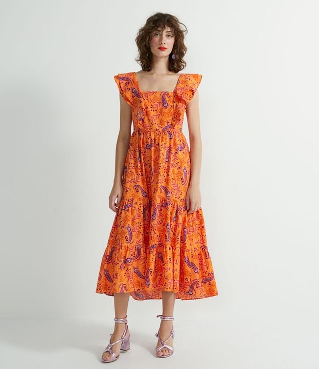Vestido Midi Sem Mangas Estampa Floral Paisley com Babados