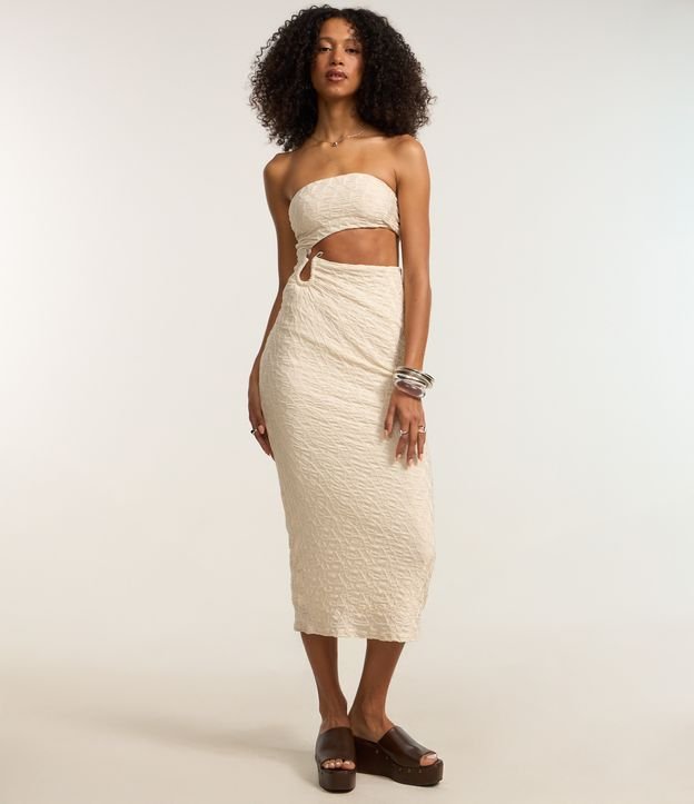 Vestido new midi com decote tomara que caia, texturizado, recorte vazado, cut out na cintura e detalhe em aviamento na lateral.
