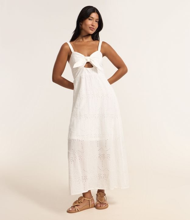 Vestido feminino confeccionado em laise de algodão certificado bci, peça no modelo new midi com decote redondo, alças médias ajustáveis, nózinho frontal com amarração, recorte e estampa furadinha tropical.
