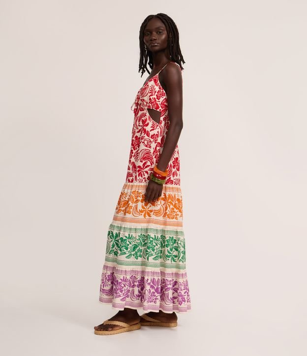 Vestido New Midi com Recortes e Estampa Tropical em Bloco de Cores Multicores