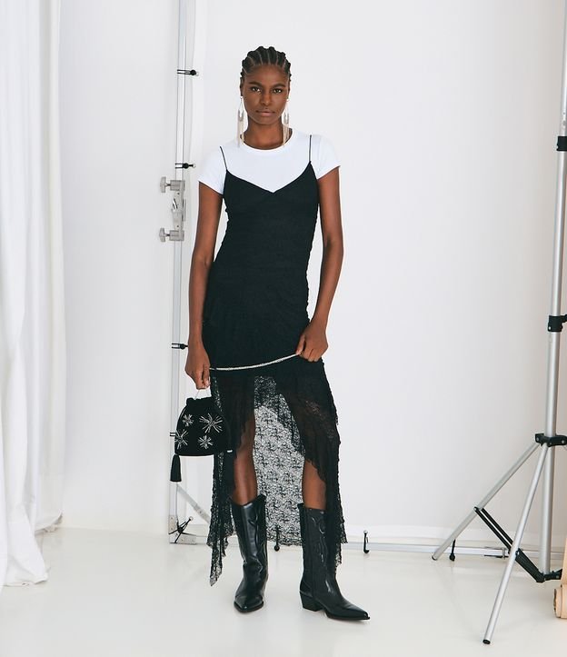 Vestido New Midi com Renda Texturizada e Alças Finas Preto