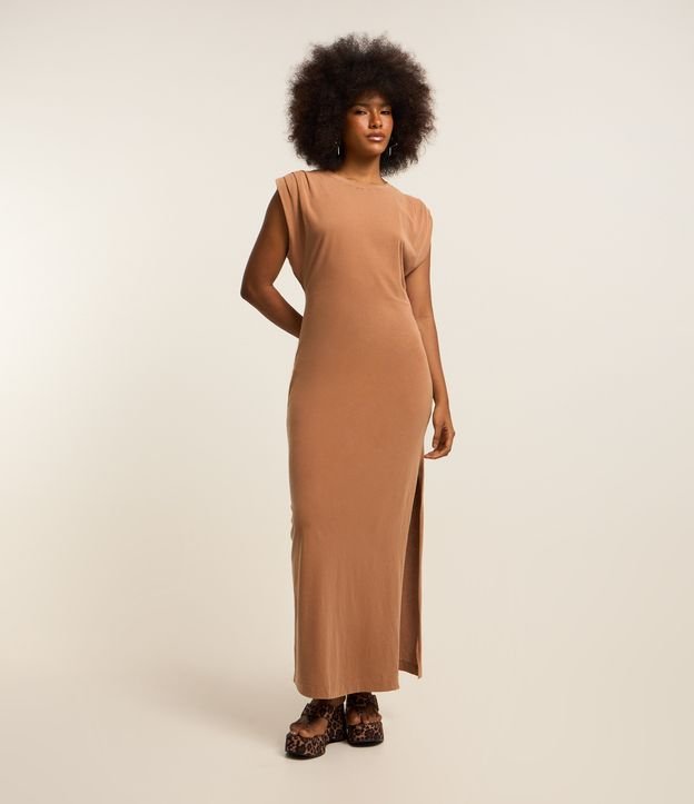 Vestido New Midi em Algodão Estonado com Fenda Lateral Marrom