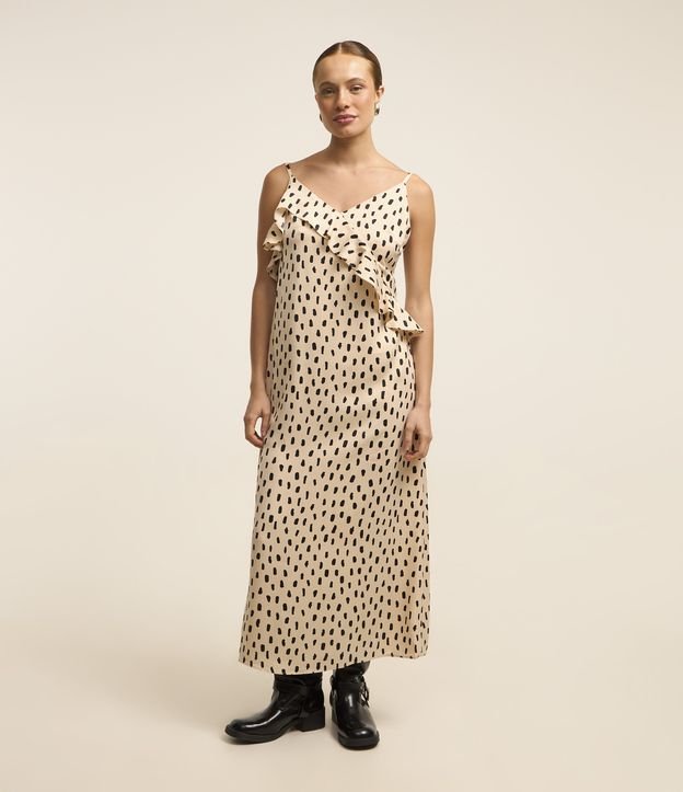 Vestido New Midi em Crepe com Estampa Poá e Babados Bege