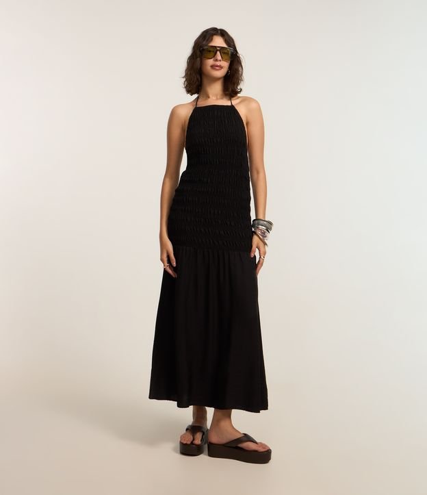 Vestido New Midi em Lastex com Gola Halter e Babado Preto