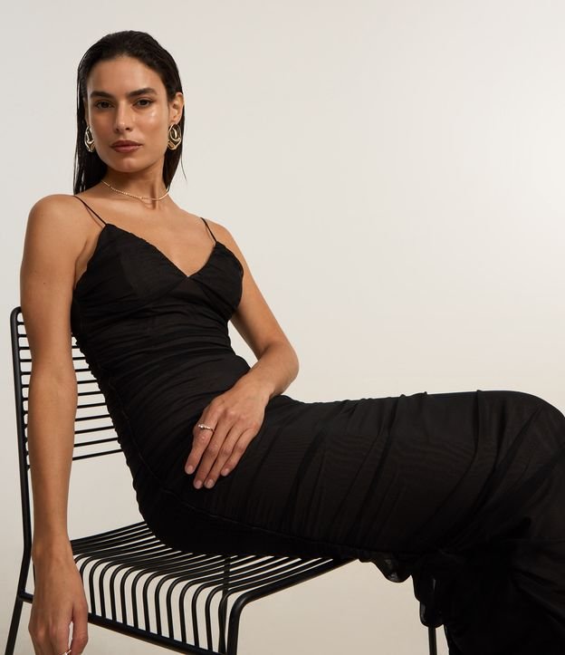 Vestido New Midi em Tule com Alcinhas Finas e Drapeado Preto