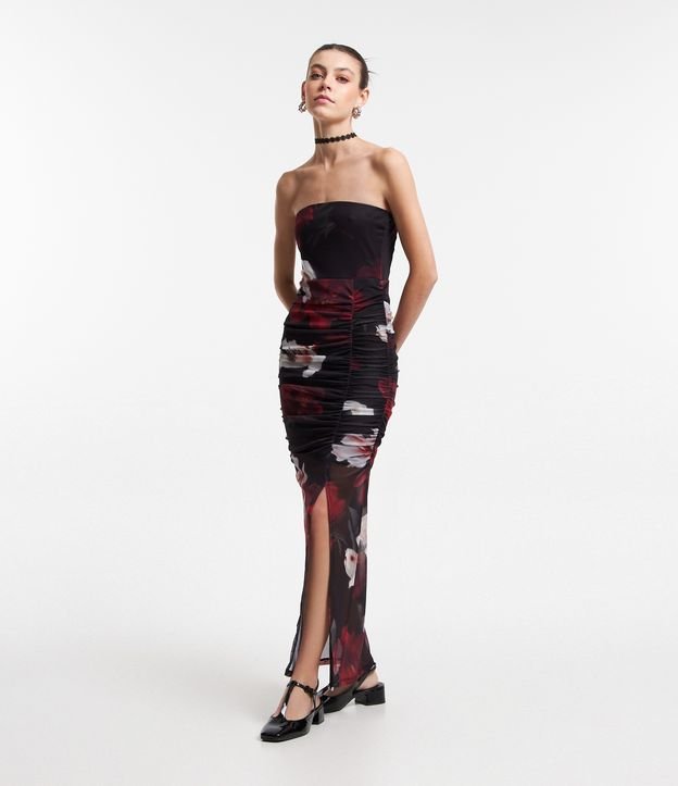 Vestido New Midi em Tule com Drapeado e Estampa Floral