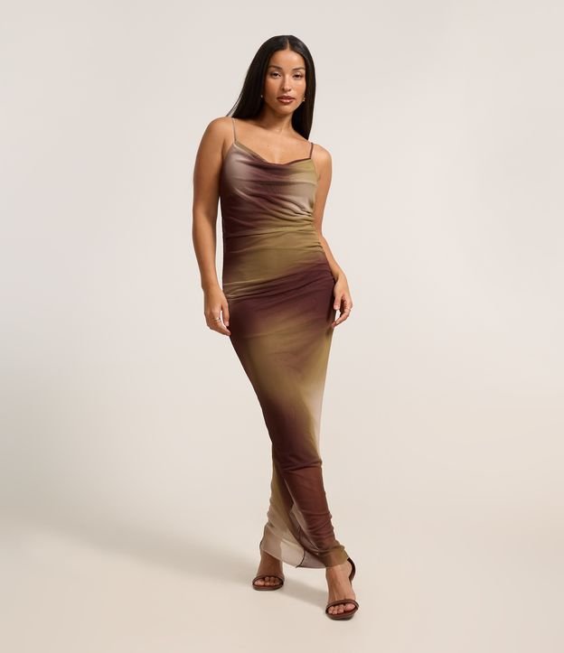 Vestido New Midi em Tule com Drapeado Lateral e Estampa Manchada Marrom