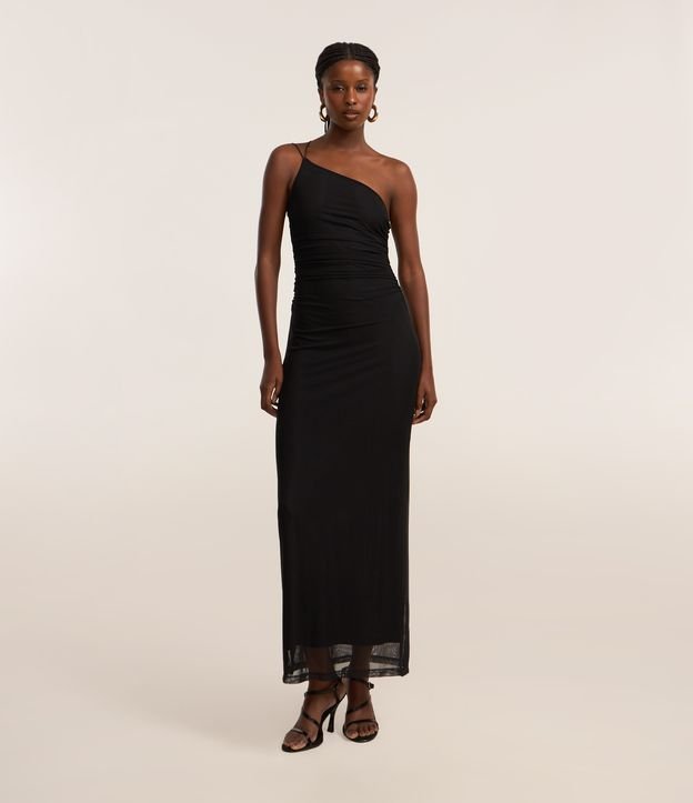 Vestido New Midi em Tule com Ombro Único e Alça Fina Dupla Preto