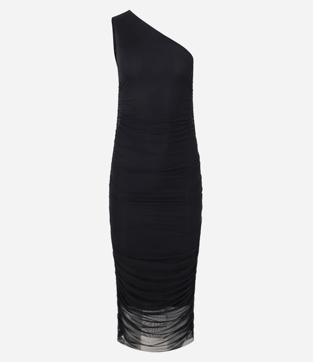 Vestido New Midi em Tule com Ombro Único e Franzido Lateral Preto