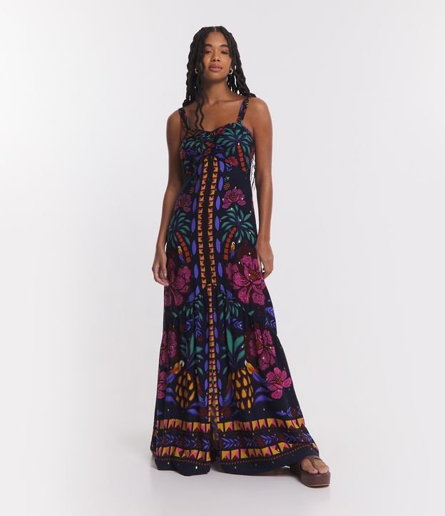 Vestido New Midi em Viscose com Busto Franzido e Estampa de Folhagens