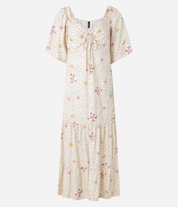 Vestido New Midi Evasê em Chalis com Estampa Floral Liberty Bege