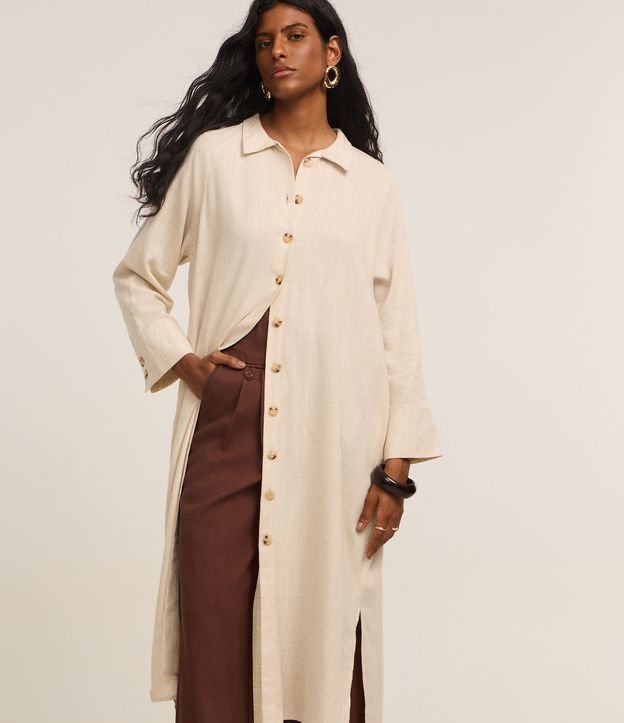 Vestido Reto Chemise em Viscolinho com Manga 7/8 Bege