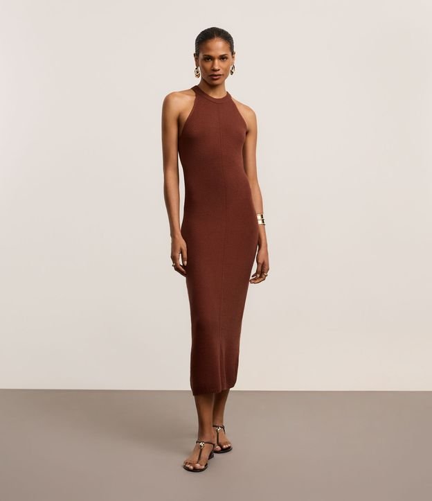 Vestido Reto Longo em Tricô com Ponto Texturizado Marrom