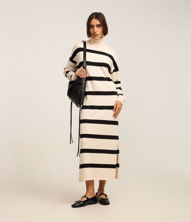 Vestido reto de comprimento midi, confeccionado em tricô com viscose mais sustentável, com gola alta e mangas longas. Roupa tem caimento leve e listras largas horizontais.