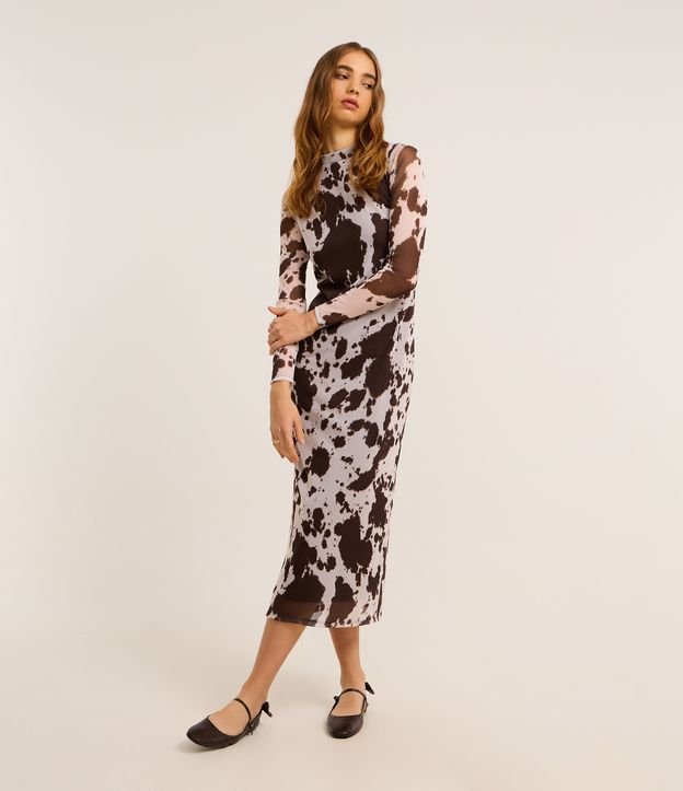 Vestido Reto Midi em Tule com Estampa Animal Print Bicolor Marrom/Branco
