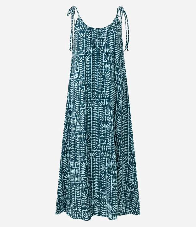 Vestido longo feminino confeccionado em viscose certificada através de boas práticas ambientais. Possui estampa geométrica, alças finas ajustáveis por amarração nos ombros e decote em formato arredondado.