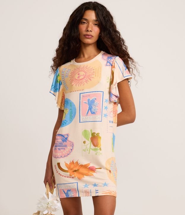 Vestido T-Shirt Dress Curto em Crepe com Estampa de Selos Bege
