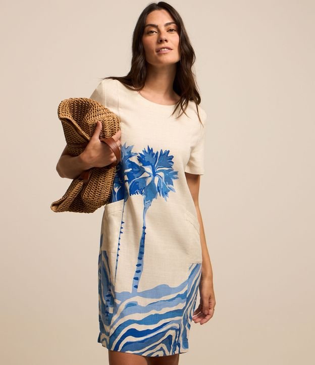 Vestido feminino, confeccionado em viscolinho mais sustentável, com decote redondo e manga curta. Peça no modelo t-shirt com estampa de natureza, trás imagem em contraste de cores que representam as ondas do mar e árvores.