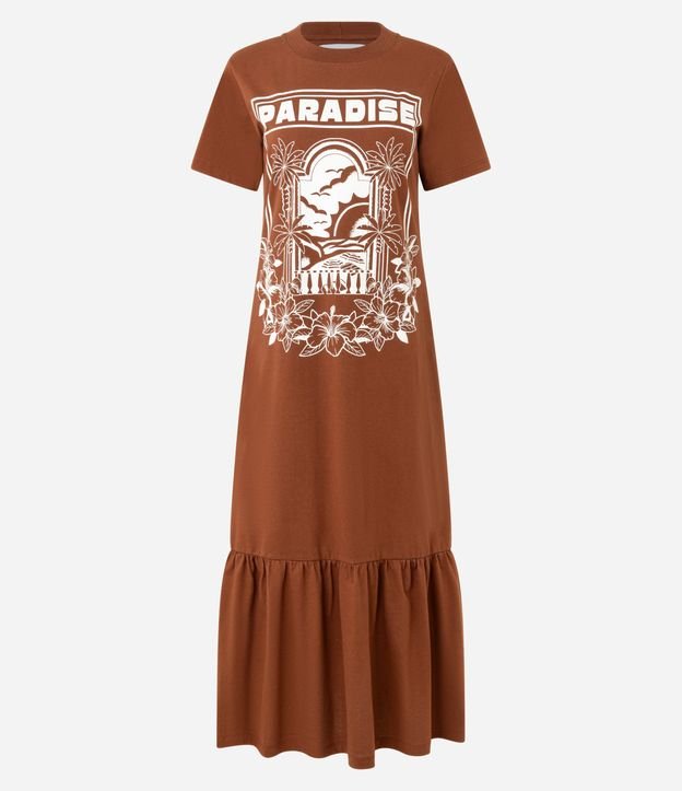 Vestido T-shirt Long Midi com Estampa de Paraíso com Babados na Barra Marrom
