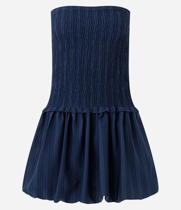 Vestido curto com modelagem tomara que caia e balonê. Possui franzido no busto e estampa xadrez, ideal para produções modernas e leves. Versátil para diferentes ocasiões em dias quentes com conforto e estilo urbano.