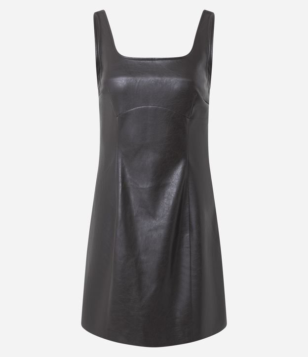 Vestido feminino curto em PU, modelagem tubinho, decote quadrado e alças largas que valoriza o corpo com efeito moderno e elegante.