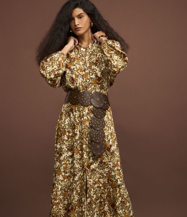 Vestido western de mangas longas, modelo bata evasê, confeccionado em chalis de viscose mais sustentável, com amarração na cintura. Peça tem estampa floral liberty.